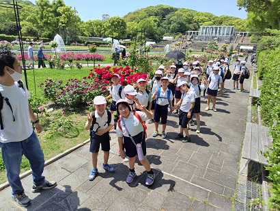 暑すぎるほどのお天気でしたが、初夏の日差しを浴びて、木々の新緑がとても鮮やかでした。また、バラがちょうど見頃で、様々な品種のバラが色とりどりの花を咲かせ、多くの人でにぎわっていました。