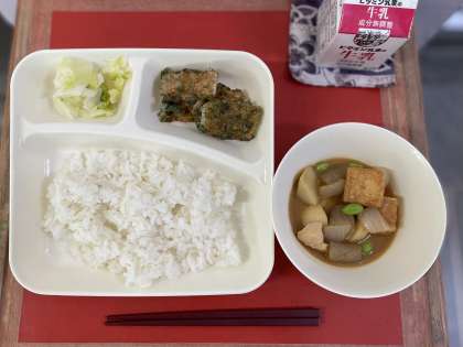今日の給食には、あつあげとさといものみそ煮に、さといもがはいっています。