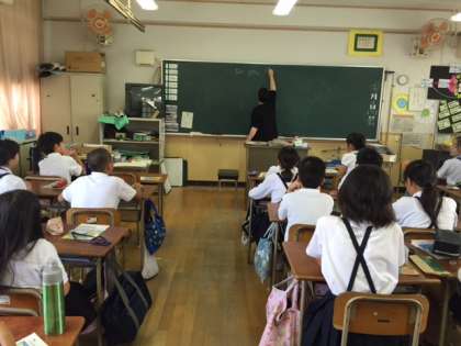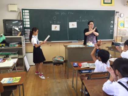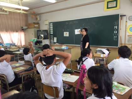 英語のドリュー スラックさんが5年2組で英語の授業をしました。