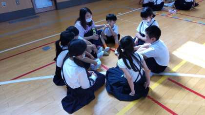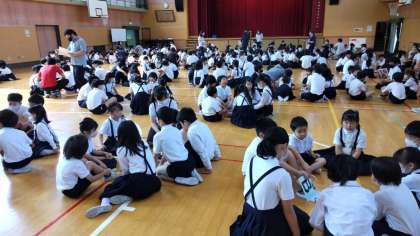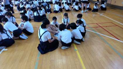今年になって、初めて縦割りで集まり児童集会をしました。はじめは名前を覚えるために、「山田さんの隣の木下君の隣の、浜本です」というようなゲームをして名前を覚えていきました。6月23日には、縦割り班で「みやこじまつり」をしますので、仲良くなってね。
