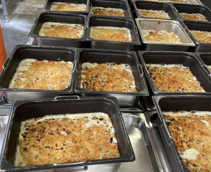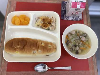 今日の給食は、さつまいもダイスがたっぷり入った、おさつパンです。