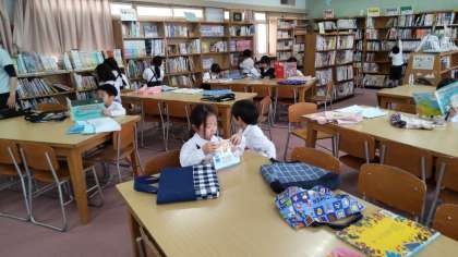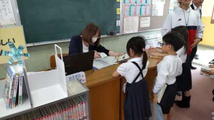 1年生の児童が図書室に行って、借りた本を返していました。本のバーコードを図書館司書さん(木曜日だけの勤務)に読み取ってもらって、元の場所に返していました。また、静かに読書もしていました。