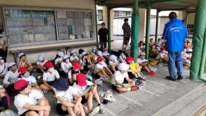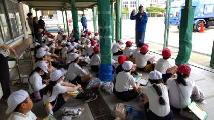 4年生は家から持ち寄った廃棄物をパッカー車に入れ、圧縮されていく様子を観察しました。どうもお世話になりました。ありがとうございました。