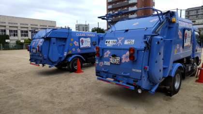 小雨の降る中、大阪市環境事業局の人が8名来られ、パッカー車も2台来ました。ごみ収集車は3色あり、普通は青色、そして赤色、緑色の三色があるそうです。青色はディーゼル車、赤色は天然ガス車、緑色はハイブリッド車で電気も使っているそうです。緑色のパッカー車は家が買えるくらいの値段だそうです。