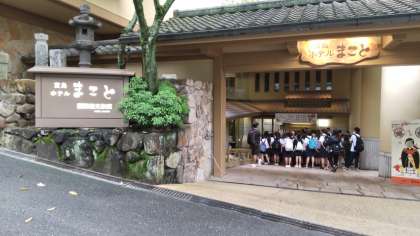 宿のまことに到着しました。 開舎式をして、広島駅から運んでもらった大きな荷物を持ってお部屋に入りました。これから、避難経路を確認する避難訓練です。