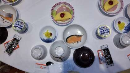 朝ごはんです。シャケ、オムレツ、ハム、レタス、ヨーグルト、おつけもの、海苔、ふりかけ、ごはん、味噌汁です。昨日の夜、食べ過ぎて具合が悪くなった人もいました。腹八分目にね。