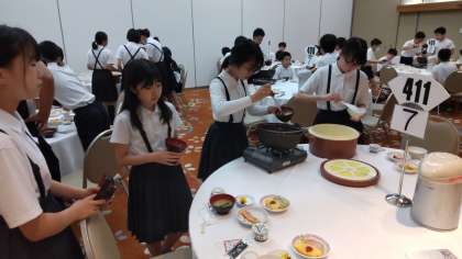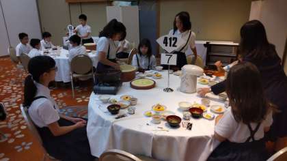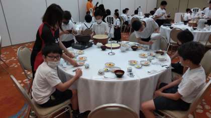 協力してごはん、お茶、味噌汁をもりつけています。いただきます。