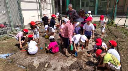 石やガラスがあれば…?心配される人もおられると思います。そのため、5月初めから、教務主任の池野先生が、草を抜き、耕し、ふるいで土を全部振るい、整備してくれています。