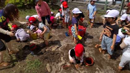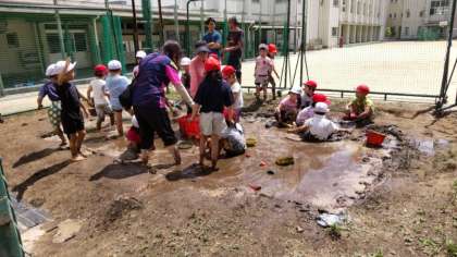5年生が田植えをする前に、田んぼに水を張って1年生がどろんこ遊びをしました。足にぬるっと来る独特の肌感覚は、気持ちよくもあり、日常あまりない感覚なのでしょうね。