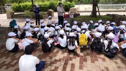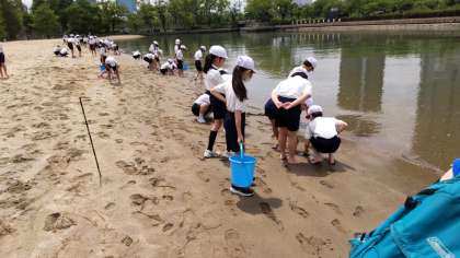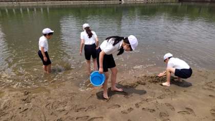 4年生は今日、大川の河川敷の「桜ノ宮ビーチ」に出かけて、大川に住む生き物の話を地域の方から聞きました。大阪湾から毛馬の閘門までは汽水域で海水と真水が混じって、両方の生き物が見られること、だから川でも潮の満ち引きがあることなどを学習しました。カニ(クロベンケイガニ)やアユ、テナガエビ、貝(マシジミ・イボカワニナ・ドブガイなど)、アオサギ、ヌートリアなどの生き物がいることも知りました。アユは、海で育ち、卵を産むために大川から京都の賀茂川そしてさらに上流に上っていくそうです。