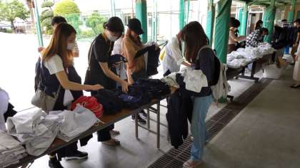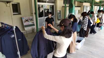 土曜参観の日の1時間目に、PTAさんによる標準服交換会がありました。たくさんの保護者の方がお越しになり、まだ使えそうなものをもらったり、自分の子どものもう小さくなった標準服を下さったりしていました。