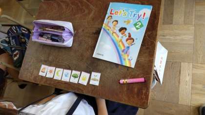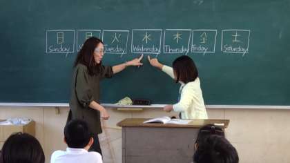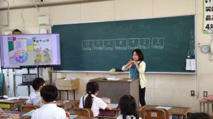 4年生は曜日を習っています。2人ペアになり、それぞれ日曜日と土曜日からスタート。出会ったところでじゃんけん。勝ったら前へ進み、負ければスタート地点に戻って、また再スタート。これを英語で話しながら行います。「じゃんけん」は「ロック、シザース、ペーパー」英語で「サンデー、マンデー、・・・・・」といいながら進みます。楽しそうにゲームをしながら、曜日の言い方を覚えていました。
