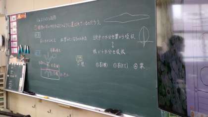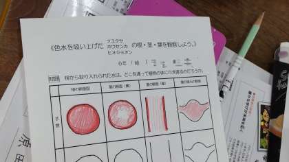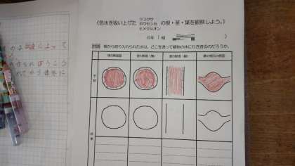 6年生は植物の水の通り道の学習をしていました。根のついた植物(ホウセンカ、ジャガイモ、ヒメジョオンなど)を色水につけるとどこを通って葉まで水が運ばれるのかという予想を立てて、自分なりの予想を発表していました。