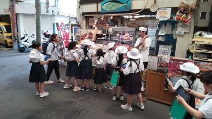 水曜日に都島神社や警察署などを回りましたが、今回は、学校の近くの商店街のお店を回りました。おかず屋さん、ボタン屋さん、布団屋さん、魚屋さん、薬屋さんなどです。