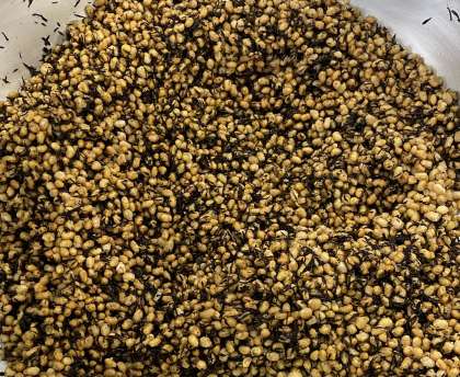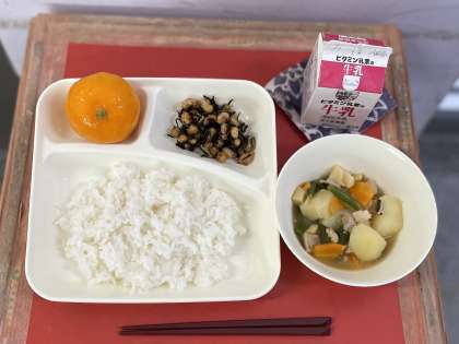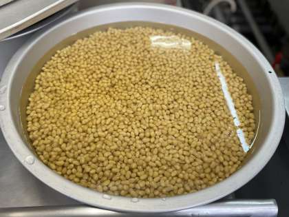 ひじき豆は、乾燥大豆を給食室でもどし、でん粉をまぶして油であげたものと、ひじき、砂糖、しょうゆで煮つめたたれをからめて作っています。