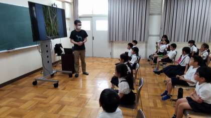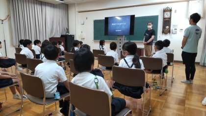 電子黒板で、自然の中にとけ込み、隠れている昆虫探しから始まり、箕面の昆虫館から持ってきてもらった実際の昆虫の観察をしました。