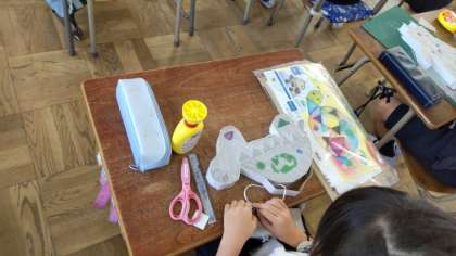 3年生は薄い紙と色セロファンや段ボールを使った「光のサンドウィッチ」という教材を作っていました。裏から光を通すときらきらと色が浮き上がってくる作品です。懇談会ではどこかに吊り下げられているかなと思います。