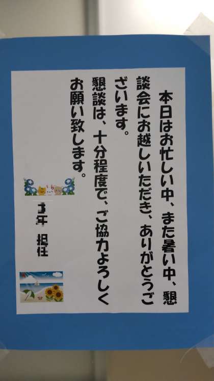 暑い中ですが、、今日から期末懇談会を4日間実施します。下校は1時15分頃になりますので、帰宅してからの生活がくずれないようにご指導お願いします。終業式は19日です。給食を食べて、5時間目終了後下校します。