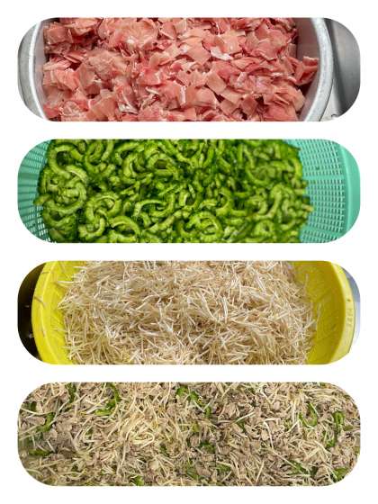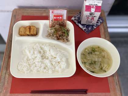 今日の給食では、塩で下味をつけ、苦みをやわらげたにがうり(ゴーヤ)と、豚肉・もやしを炒め、塩・こいくちしょうゆで味付けしたゴーヤチャンプルーに、かつおぶしをかけていただきました。