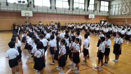 まず、1学期を振り返って校長先生からお話がありました。忘れてはいけない3つのこと。それは、「ありがとう」「平和」「自分の頑張り」の3つです。お家に帰って、家族の人に「ありがとう」と言ってねというお話です。何人の子が実践できるでしょうか。