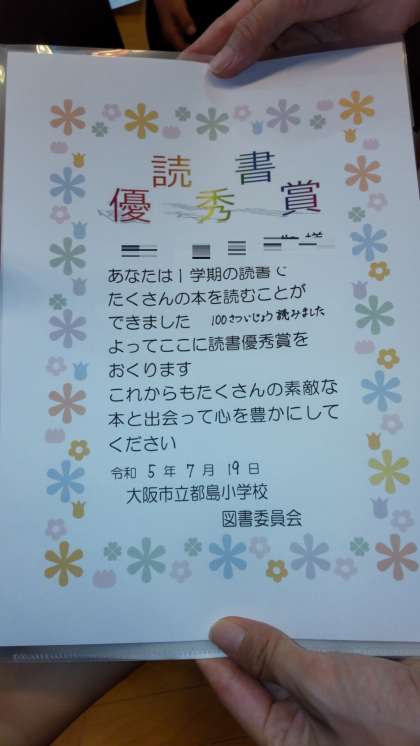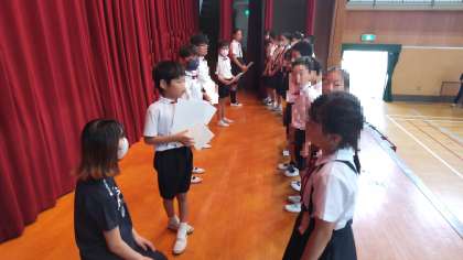 そして、夏休みの生活のお話、読書委員会から1学期の読書記録の表彰状渡し、最後に校歌を歌って終業式が終わりました。
