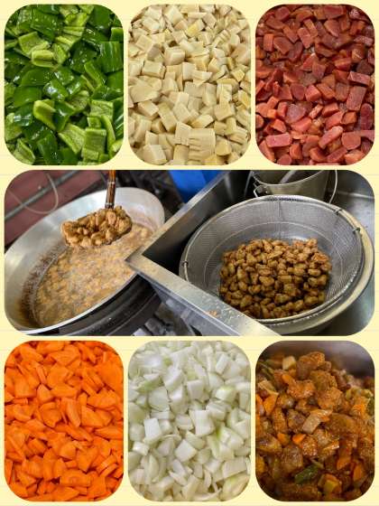 2)にんじん、たまねぎ、たけのこ、ピーマンなどの野菜をいためる。