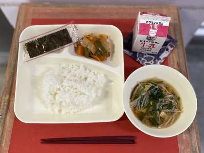 中華みそスープは、鶏肉を主材に、もやし、コーン、にら、干ししいたけを使用し、赤みそなどで味付けしています。