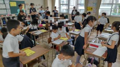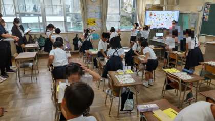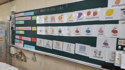 3年生は外国語活動で、ジングルを歌ったり、ポイントゲームをしたり、ビンゴゲームをしたり楽しく活動していました。What fruits (colors/sports)do you like? I like 〜」という言い回しを練習していました。楽しく活動していました。