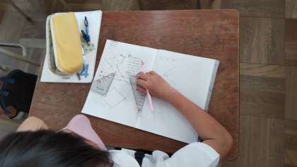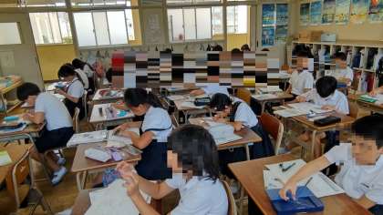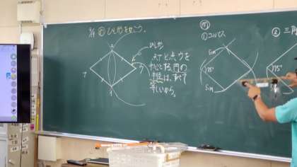 4年生は三角定規や分度器、コンパスを使って、ひし形や三角形を描く学習をしていました。みんなコンパスを上手に使っていました。