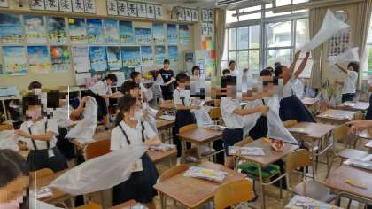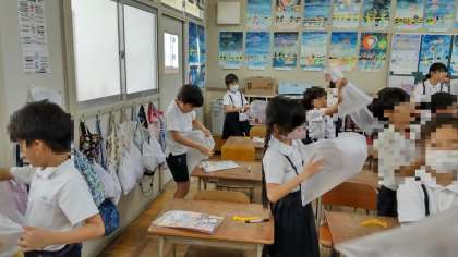 4年生は理科の「空気や水の性質」の学習の導入になる時間を学習していました。空気は、圧し縮めることができ、元に戻ろうとする力が働くこと。水は全く圧し縮めることはできない。という性質を学習し、その性質を利用したものが、ボールやタイヤ、スプレー(ガスボンベ)、自転車の空気入れ、空気でっぽうなどがあることを学習していきます。