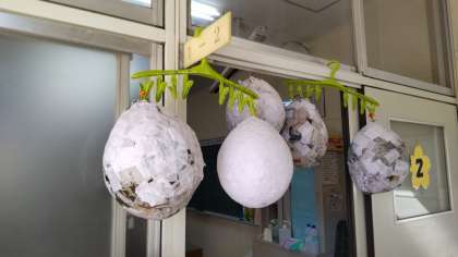 1年生の「不思議なたまご」が、新聞紙から白い紙にジャンプアップしました。たまごの殻の紙が乾いて固くなると中の風船の空気を抜きます。それから装飾に入りますが、教室は卵が22個もあってとてもにぎやかです。