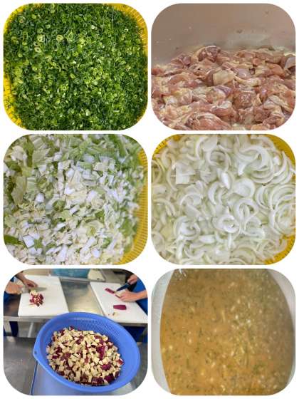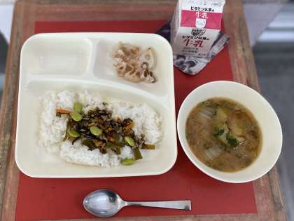 〔給食では、ごはんと具を混ぜて食べます。〕