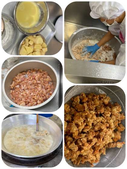 揚げたときにしょうゆの色が赤くなり、衣が白く浮かぶ様子が、紅葉が流れる竜田川に見えることから「竜田揚げ」の名がついたといわれています。