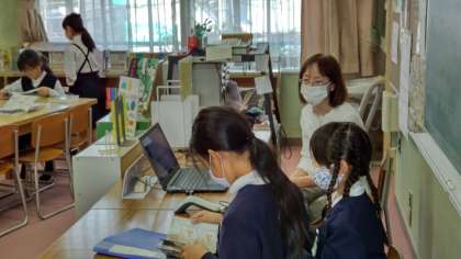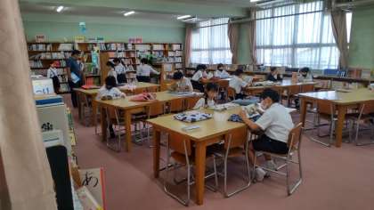 4年生の図書の時間をのぞいてみると、今日は木曜日で図書館補助員の方が見えられていました。本の修理や貸し出しなどいろいろなことを助けてもらっています。今は週に1回の派遣ですが、もっと増えることを願っています。