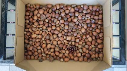 この大量のドングリは、2年生が服部緑地に校外学習に行ったときに全員で拾ったドングリの一部です。30分くらいかけて拾いました。1年生に半分くらいプレゼントして、ドングリゴマを作ったり、落ち葉と一緒にお面を作ったりするそうです。楽しみですね。