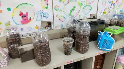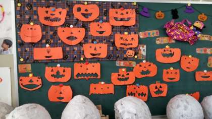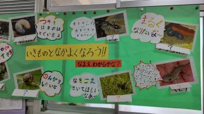 1年生はこないだから虫探し、虫集めをしていましたが、飼育して気づいたことの発表会がありました。教室の背面黒板は、ハロウィンのお化けになっていました。