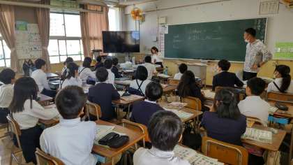5年生は、英語活動で、キャスリーン先生と「どこにありますか?」「Where is it on?」の答え方を、一部だけが見えるようになった画像を見て学習していました。とても楽しそうでした。「on the desk」「on the table」「on the shoes box」などと画像を見て答えていました。
