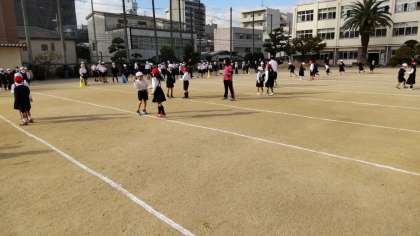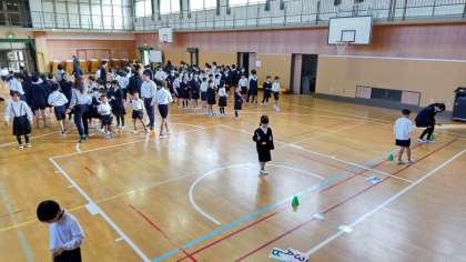 秋になり、かなり過ごしやすい日が続いていますので、児童集会は運動場と講堂に分かれて、体を動かす遊びをしています。「追いかけじゃんけん」と「スプーンリレー」をしています。