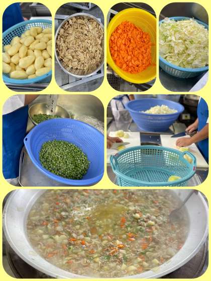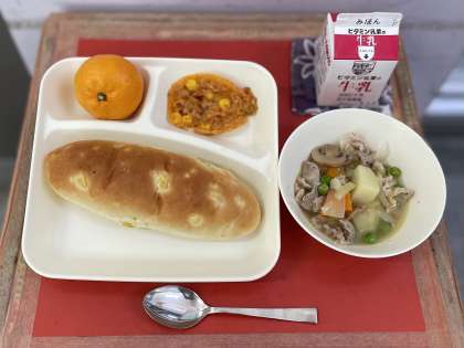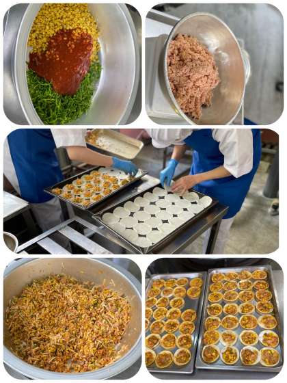 変わりピザは、ツナ、コーン、ピーマン、ピザソース、チーズを混ぜ合わせて、餃子の皮にのせ、焼き物機で焼いています。