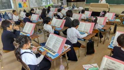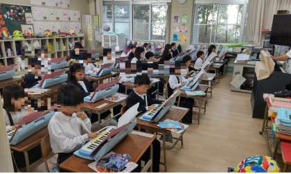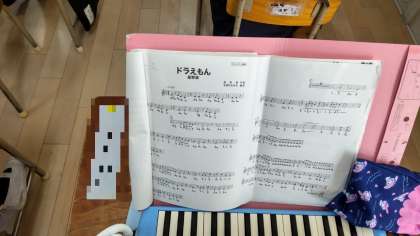 1年生は、音楽の時間に鍵盤ハーモニカで「ドラえもん」の歌を練習していました。こんな高度な曲をよくふけるなあと思いました。すばらしいですね。音もきれいに出ていました。