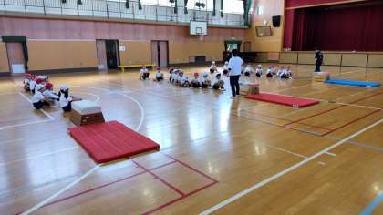 2年生は、体育で跳び箱を出して、手をついて跳び箱に飛び乗り、ジャンプして降りる運動をしていました。手首に負荷をかける器械運動の準備運動です。これからいろいろな技になっていくのでしょう。