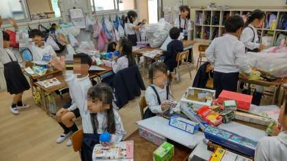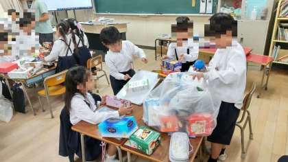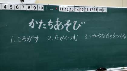 1年生は、いろいろな形の箱や入れ物を家から持ってきて、「かたち」の学習をしていました。6年生まで続く学習で、最終的には三角錐や円柱、円錐、正八面体などの名前が出てきます。今日は、転がる形、転がらない形、高く積める形などを実際に転がしたり積んだりして学習していました。みんなとても生き生きとしていました。