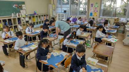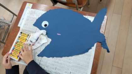 1年生は、紺色の紙を手で魚の形に切り、クレヨンで眼を書いていました。手でちぎるとなかなか面白い形になります。
