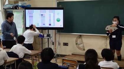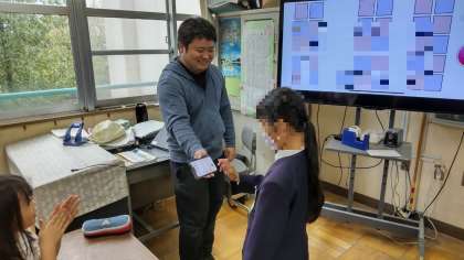 4年生は、先生のスマホを押して、大型テレビにランダムに自分の名前が示されるという席替えをしていました。前にいる中学生は、都島中学校の2年生で、職場体験に来てくれた中野小学校の卒業生です。先生の補助をして、次にボタンを押す人の指名をするお手伝いをしていました。