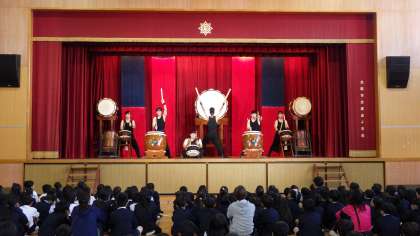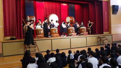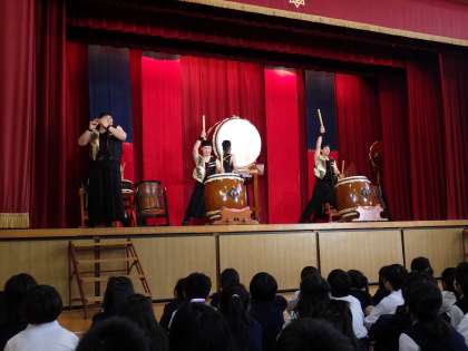 今日は、「瑞宝太鼓」のみなさんにご来校いただき、「生きた音を感じる」瑞宝太鼓学校公演を実施していただきました。