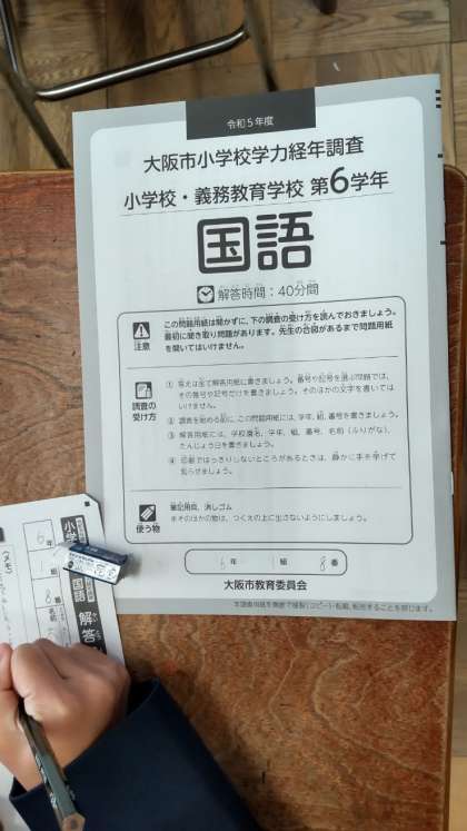 大阪市の3年生以上の小学生は全員、本日2時間目に国語、3時間目に社会の学力経年調査をしています。校舎は静まり返り、教室は鉛筆の音しかしていませんでした。みんな、しっかり問題を読んで実力を発揮してね。
