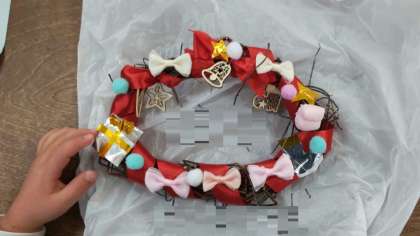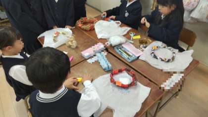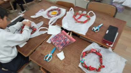 リュウキュウアサガオのつるで作った「クリスマスリース」をさらに飾り付けていました。色紙を使ったり、ビーズをちりばめたり、リボンをつけたり、雪に似せた綿のようなものをつけたりしていました。かなり完成に近づいてきました。