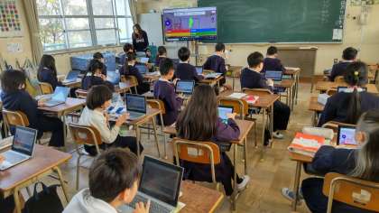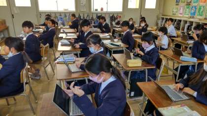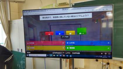 4年生は、社会科で日本の県名や県庁所在地を学習しています。一人一台端末と大型テレビを使って、県に関するクイズ大会をしていました。例えば、「かきくけこ」で始まる県は、日本にいくつあるでしょうか…?