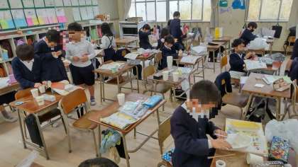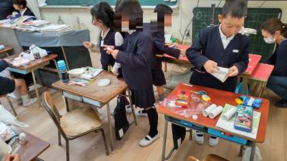 2年生は、先週設計図を描いてイメージ化した「動くおもちゃ」を作っていました。ポッキーの空き箱を持ってきたり、ストローを持ってきたりしていました。
