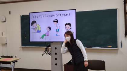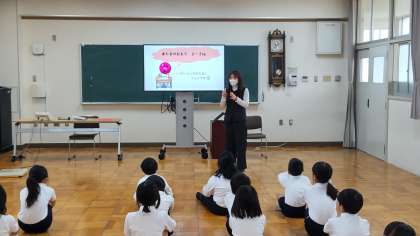 2年生の二測定の機会を利用して、養護教諭から良い姿勢についてお話がありました。プレゼンテーションしながら、座り方や立ち方、悪い姿勢だと体にどのような変化が起こるのかなどを考えさせていきました。